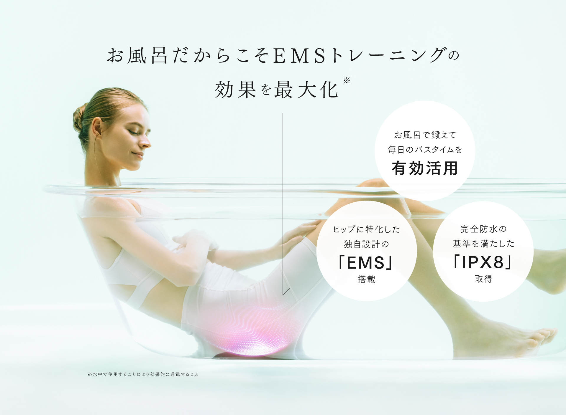 EMS技術を得意とした「MYTREX」だから生み出せた完全防水のヒップトレーニングマシーン。毎日入るお風呂だから続けられる。
