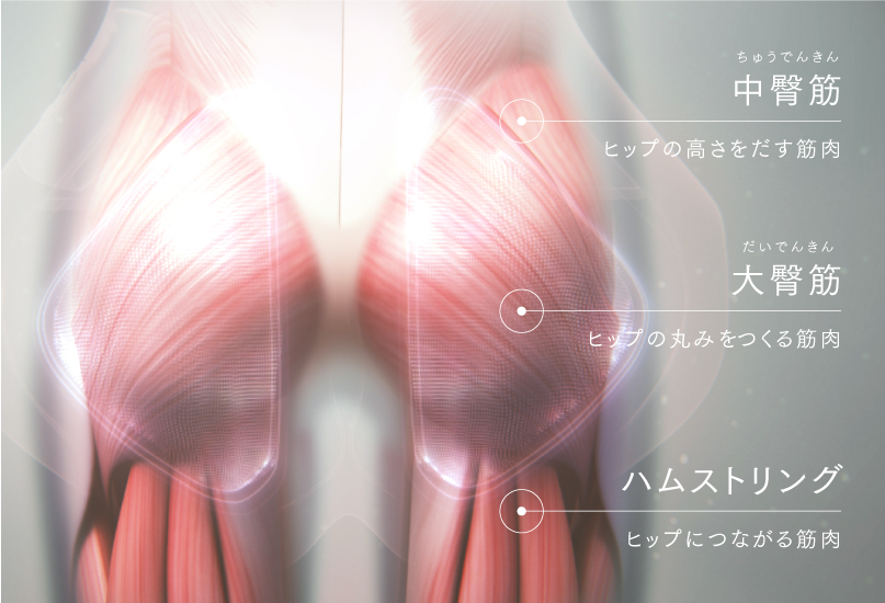 お尻やハムストリングスなど下半身の大きな筋肉に強く、深くアプローチできるよう周波数、波形、電圧を設計した独自のEMSプログラムを搭載。自信の持てる理想のヒップラインへと導きます。
