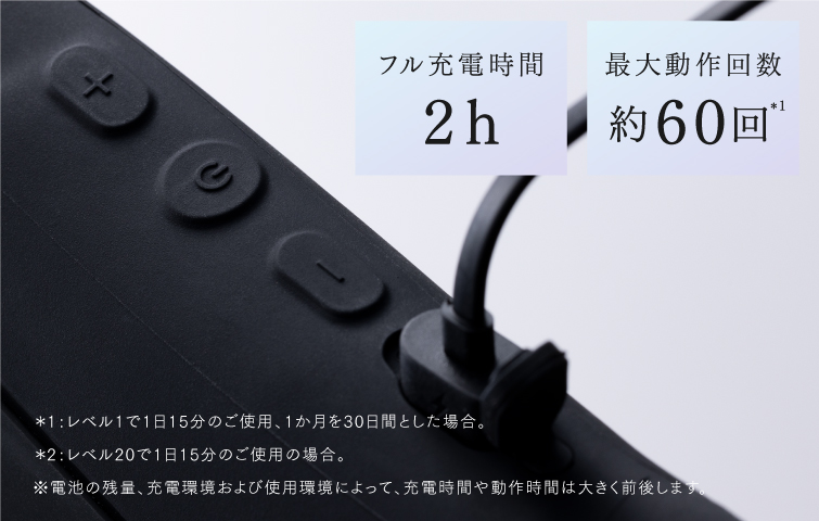 バッテリー長持ちでより続けやすく。レベル1でご使用の場合はフル充電から約60回*1使用可能!最大パワーのレベル20でも約18回*2使用可能!