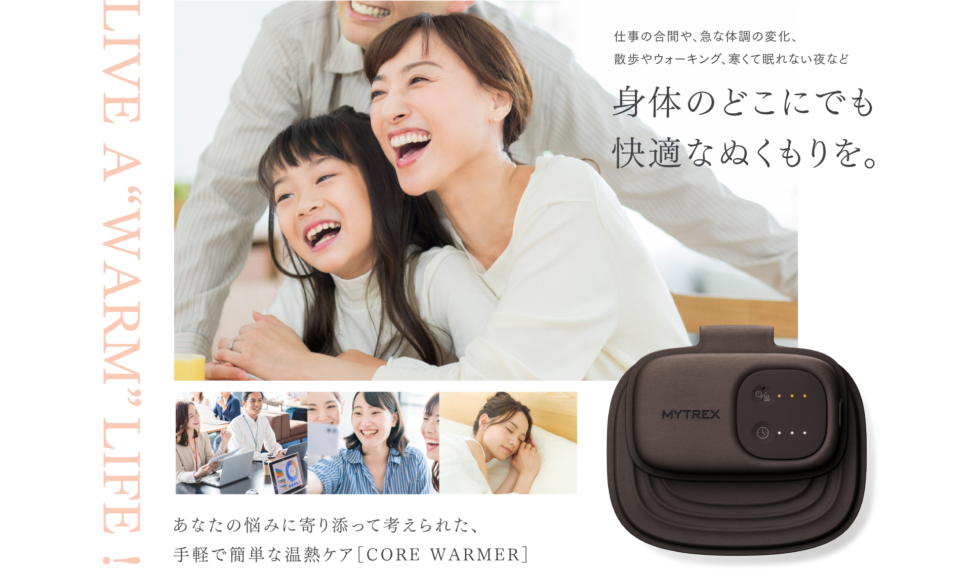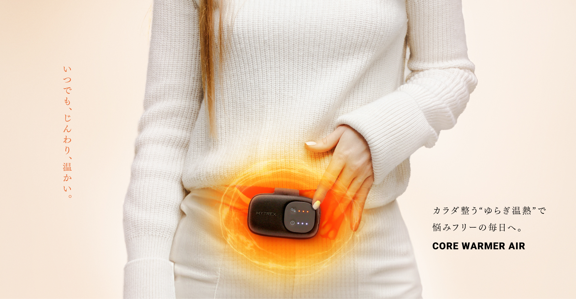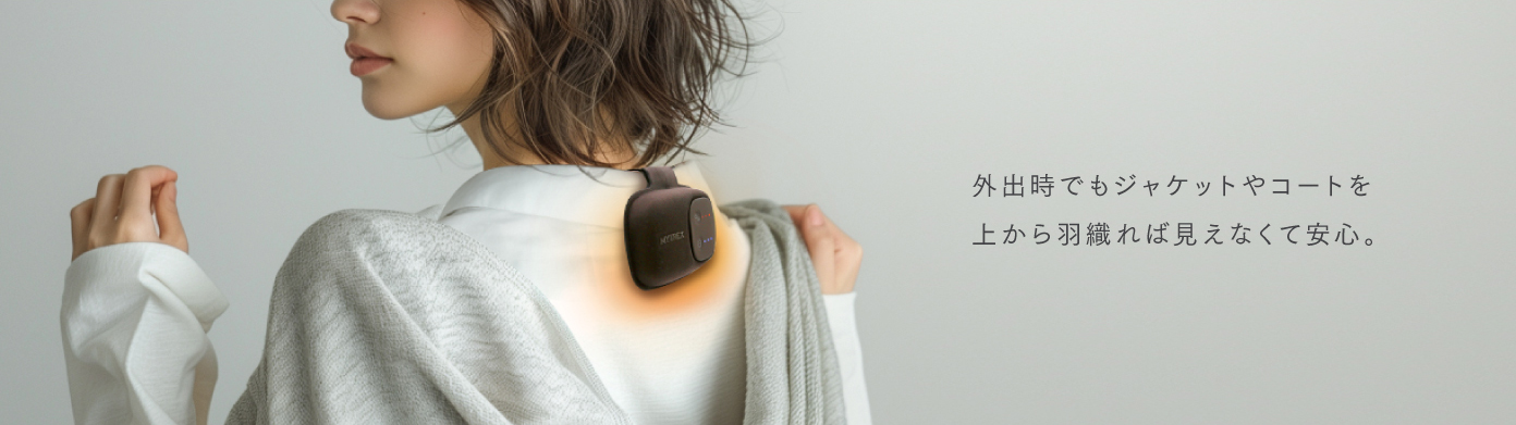 日常に溶け込む軽くて心地よいぬくもりで、仕事や家事中はもちろん移動中でも、カラダ整うスマート温活をお届けします。