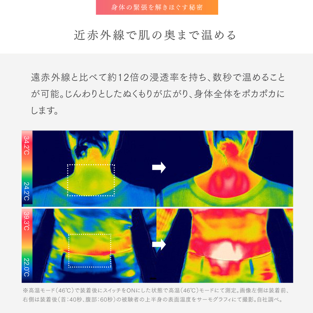 ※高温モード(46℃)で装着後にスイッチをONにした状態で高温(46℃)モードにて測定。画像左側は装着前、右側は装着後(首:40秒、腹部:60秒)の被験者の上半身の表面温度をサーモグラフィにて撮影。自社調べ。