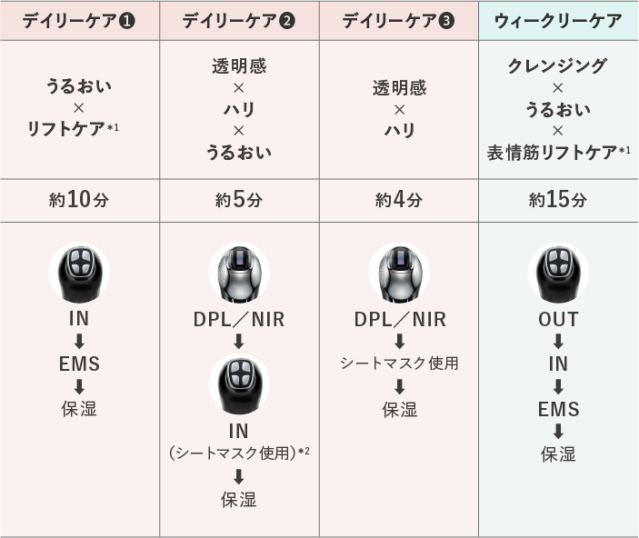 毎日交互にデイリーケア(DPL/NIR)、3日に1回ウィークリーケア(OUT/IN/EMS)を実施。