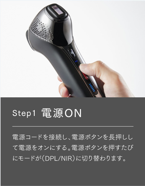 Step1電源ON電源コードを接続し、電源ボタンを長押しして電源をオンにする。電源ボタンを押すたびにモードが(DPL/NIR)に切り替わります。