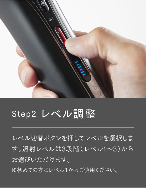 Step2レベル調整レベル切替ボタンを押してレベルを選択します。照射レベルは3段階(レベル1~3)からお選びいただけます。
