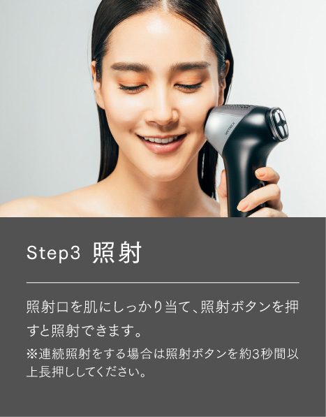 Step3照射照射口を肌にしっかり当て、照射ボタンを押すと照射できます。