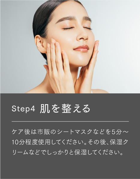 Step4肌を整えるケア後は市販のシートマスクなどを5分~10分程度使用してください。その後、保湿クリームなどでしっかりと保湿してください。