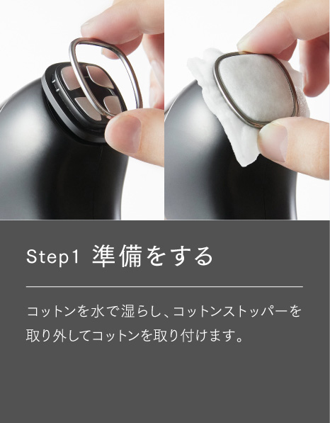 Step1準備をするコットンを水で湿らし、コットンストッパーを取り外してコットンを取り付けます。