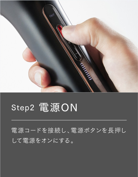 Step2電源ON電源コードを接続し、電源ボタンを長押しして電源をオンにする。