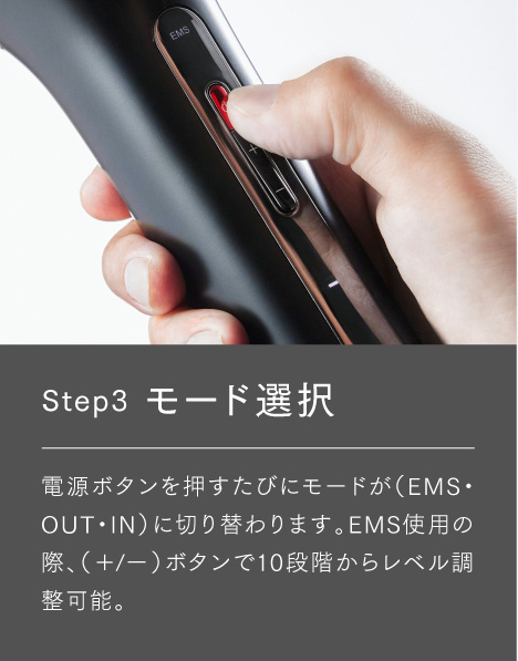 Step3モード選択電源ボタンを押すたびにモードが(EMS・OUT・IN)に切り替わります。EMS使用の際、(+/ー)ボタンで10段階からレベル調整可能。