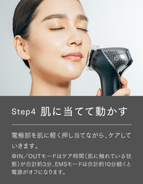 Step4肌に当てて動かす電極部を肌に軽く押し当てながら、ケアしていきます。