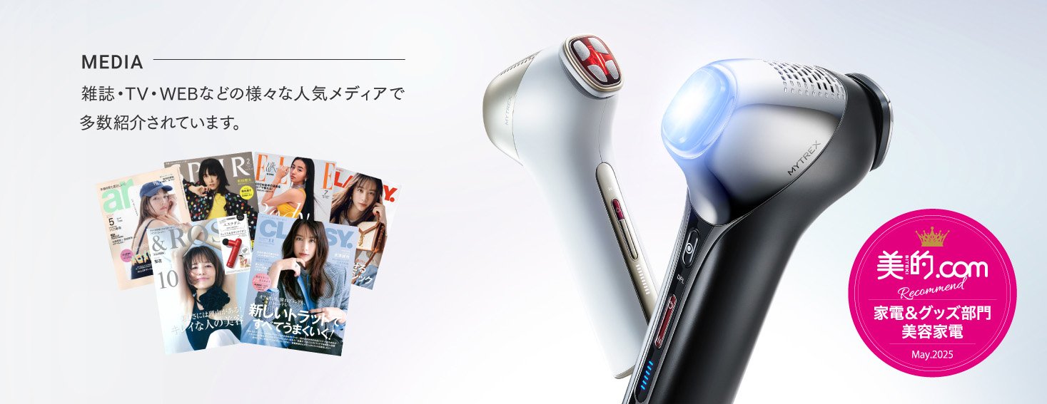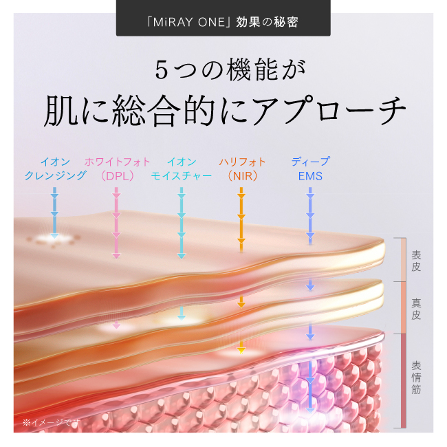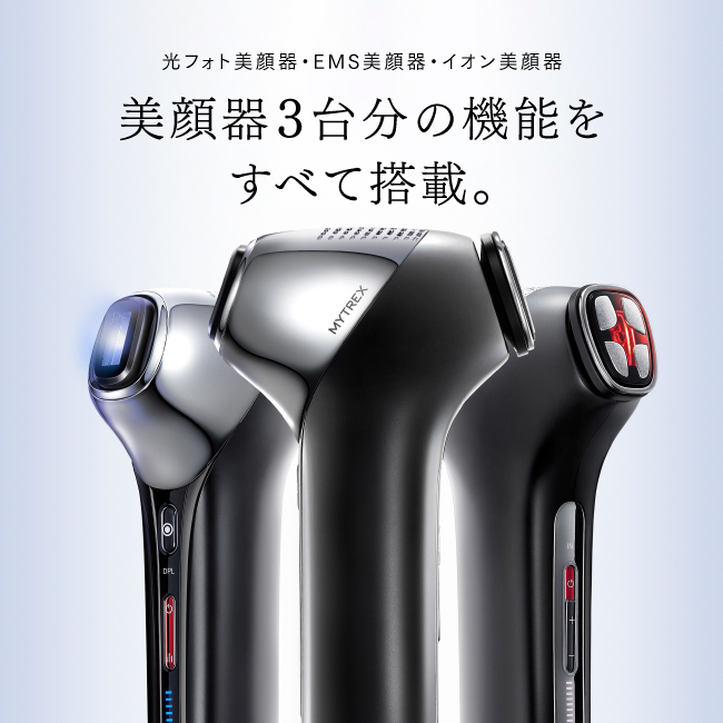 マイトレックス ミライワンは、エイジングケア*1に必要な5つの機能で、肌へ総合的にアプローチ。サロン級のフォト美容(ホワイトフォト/ハリフォト)による極上の「透明ハリ感*2」、EMSによる「リフトケア*3」、イオン導入導出による「うるおい」を叶えてくれます。使いやすさにもこだわり、ストレスフリーで簡単ケアが可能。これ1台で、輝く美容習慣を。