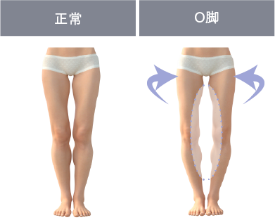 O脚というと、膝が外側を向いているイメージがあるかもしれませんが、実際は逆。女性の場合、膝が内側にねじれている内股の状態であることが多いんです。