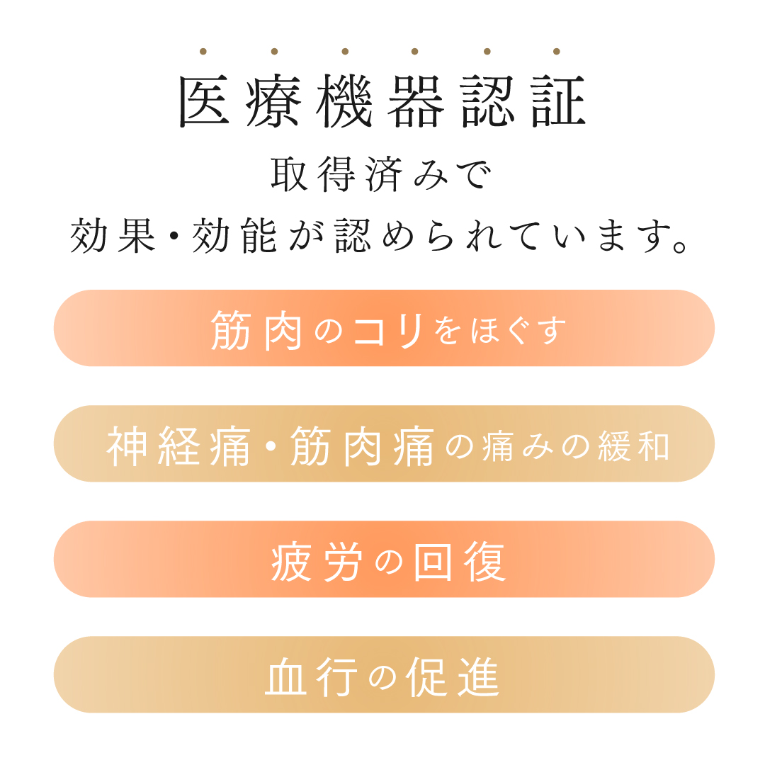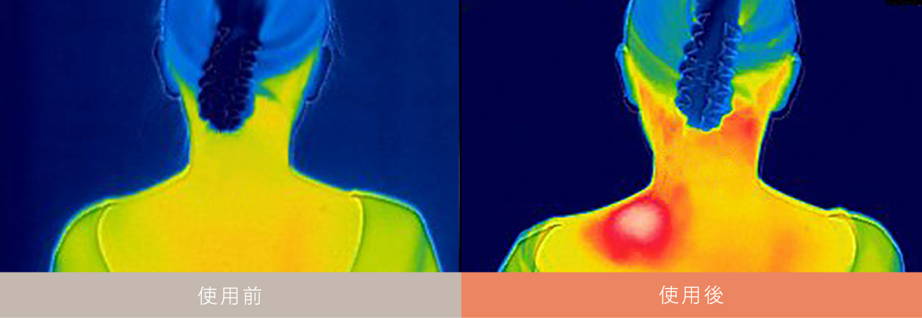 筋肉を暖めながらほぐすことで、筋肉痛や神経痛の痛みを和らげます。また冷えからくる、コリや痛みにも温熱がピンポイントに刺激し緩和します。