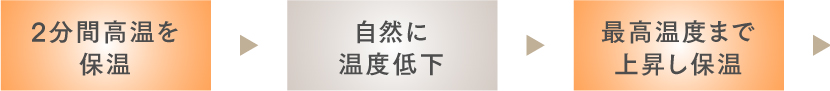 各モードの最高温度まで上昇したあと、約2分間保温します。自然に温度が低下したあと、また最高温度まで上昇し約2分間保温します。電源がオフになるまで、このサイクルを繰り返します。