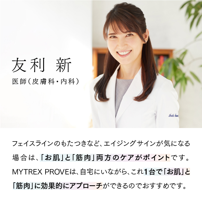 MYTREX PROVEは、自宅にいながら、これ1台で「お肌」と「筋肉」に効果的にアプローチができるのでおすすめです。ブラシ型はお肌にトントン当てるだけでいいので、肌への摩擦が気にならないのもいいですね。私は撮影前などサッと変化が欲しい時に使用しています。