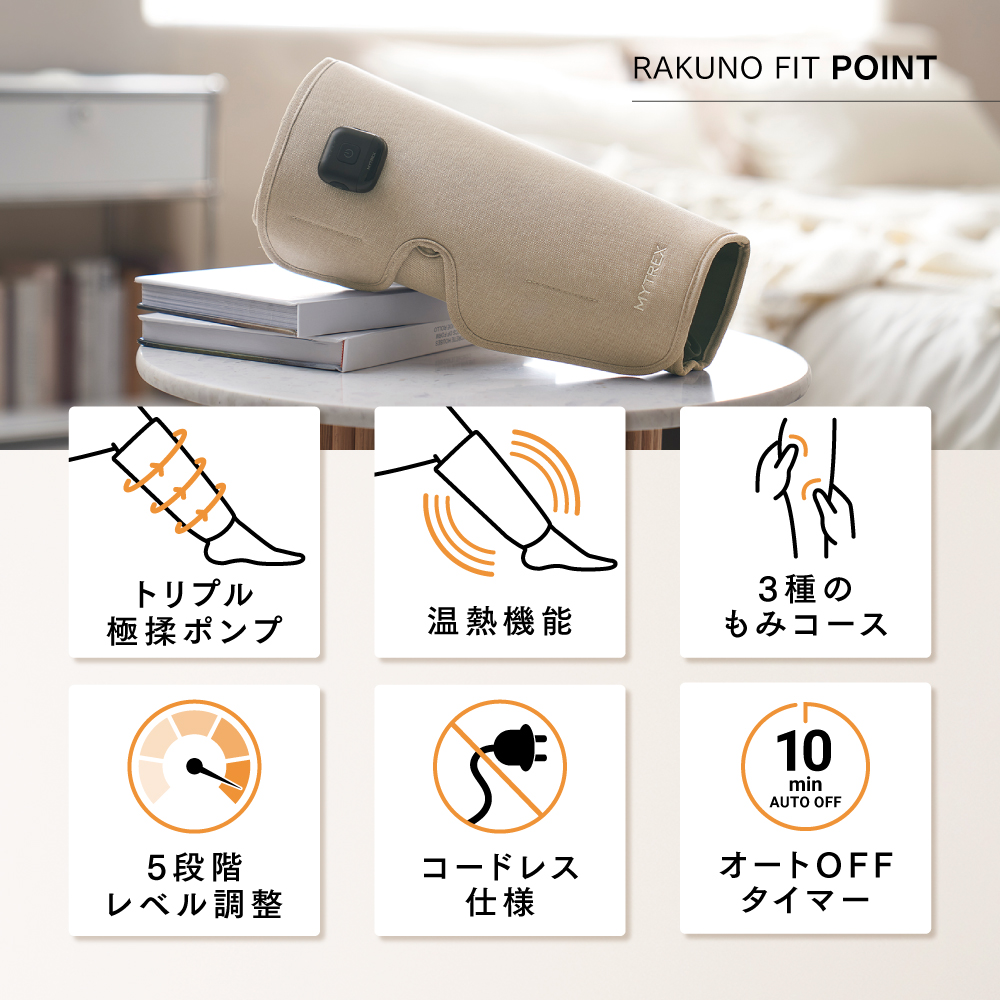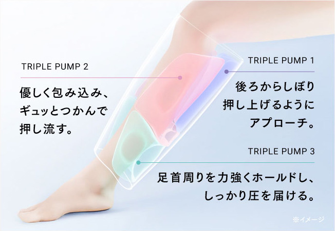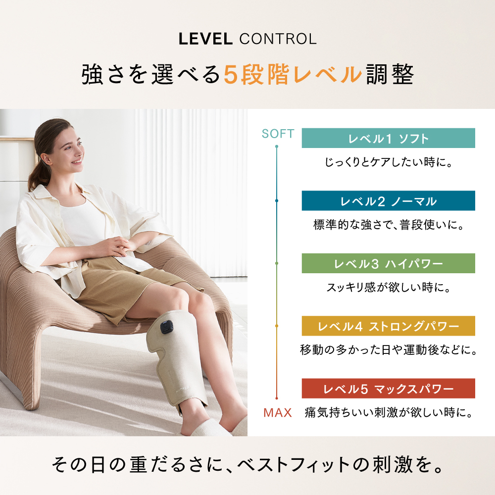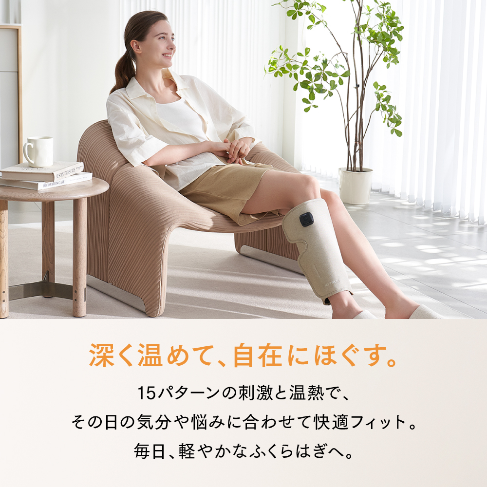 3種のもみコースと5段階レベル調整で、計15パターンの刺激を実現。温熱機能との組み合わせで、上質なふくらはぎケアが行えます。3つのエアポンプの力強さと丁寧さを併せ持つ刺激は、まるで手で包み込みながら揉まれているような体感。やすらぎたい日も、しっかり刺激を感じたい日も。その時の気分にフィットした気持ちよさでふくらはぎを癒します。