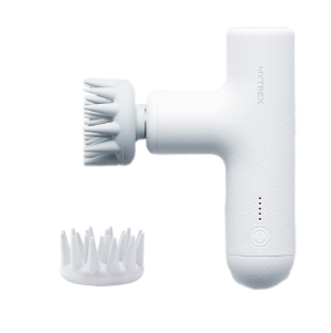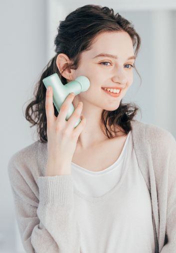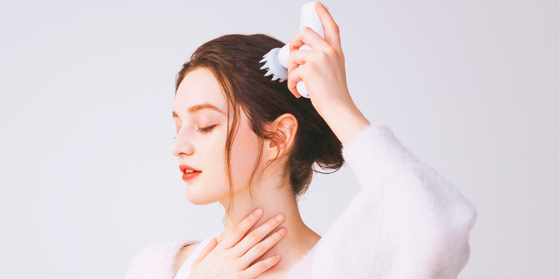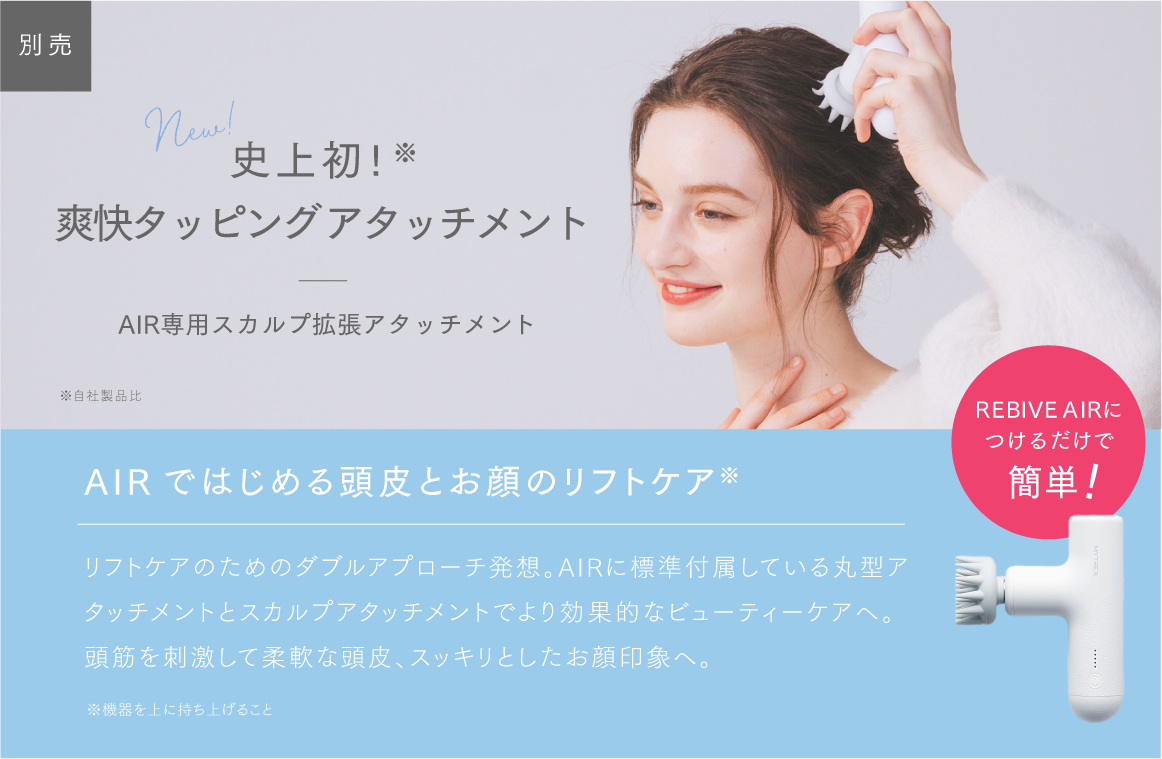 リフトケアのためのダブルアプローチ発想。AIRに標準付属している丸型アタッチメントとスカルプアタッチメントでより効果的なビューティーケアへ。頭筋を刺激して柔軟な頭皮、スッキリとしたお顔印象へ。