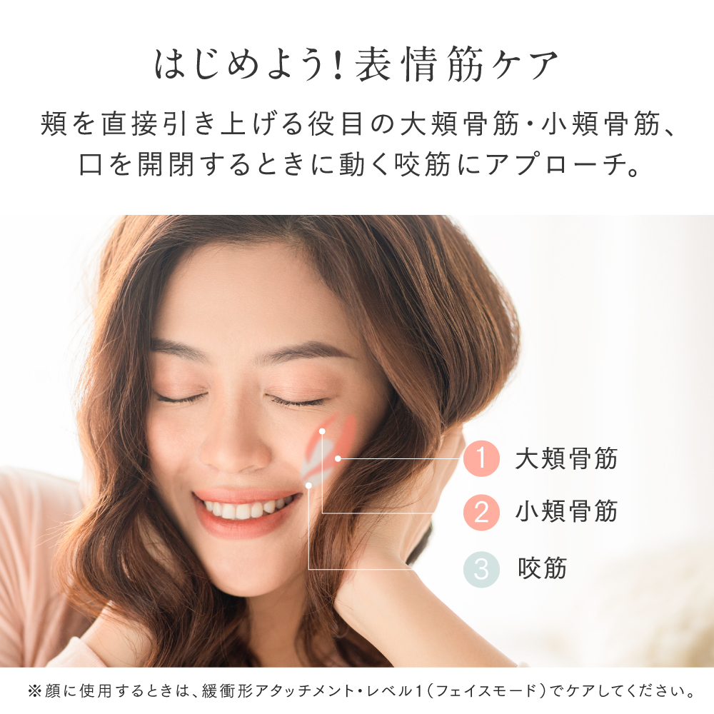 ※顔に使用する場合は、必ず緩衝形アタッチメントを使用し、レベル1で肌に軽く触れる程度に当ててご使用ください。※目の周りや骨部への使用を避け、顔全体で3分以内を目安としてください。※異常を感じたときは直ちに使用を止めてください。