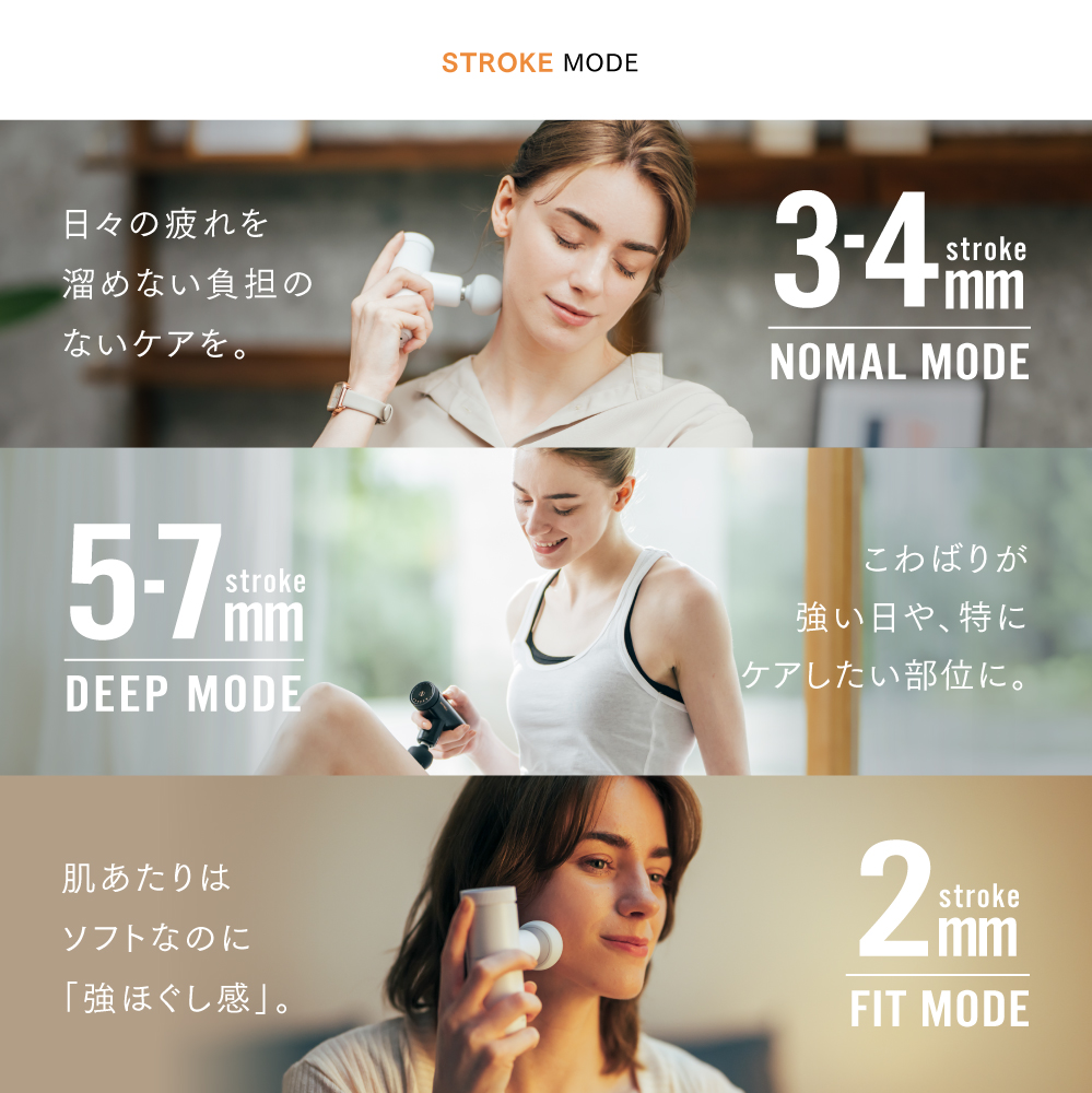 30パターンの刺激から気持ちよさを選べる第2世代ハンディガンが誕生。従来では速さ(振動スピード)調節のみだったハンディガンに【手圧変動テクノロジー】が加わり、新しく深さ(ストローク)の調整が可能に。体からのリクエストにピンポイントで応える整体師の手圧のような体感を実現しました。“30通りの刺激”で使う人の体・部位にマッチした、最適で新しい気持ち良さをお届けします。
