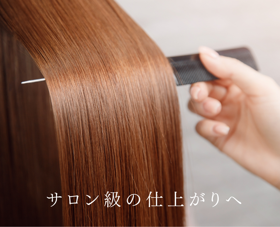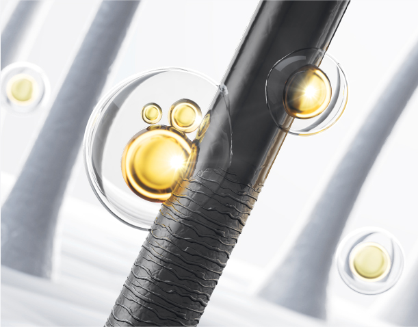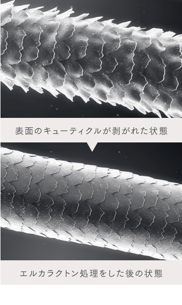 ナタネ種子から得られる植物由来成分エルカラクトン。加齢やカラーリングにより表面のキューティクルが剥がれた毛髪の“へたり”をドライヤーの熱により反応させ結合。ハリ・コシを取り戻しながらうねり・絡まり・手触り感を改善します。