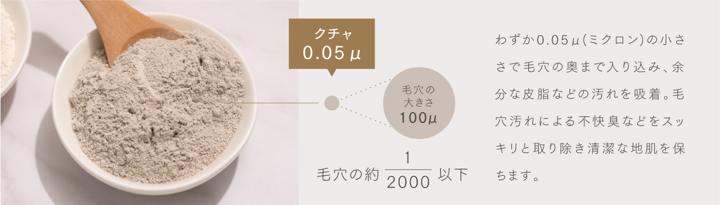 わずか0.05μ(ミクロン)の小ささで毛穴の奥まで入り込み、余分な皮脂などの汚れを吸着。毛穴汚れによる不快臭などをスッキリと取り除き清潔な地肌を保ちます。