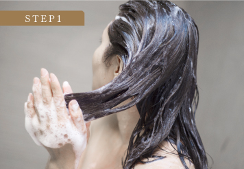 頭皮と髪をぬるま湯でしっかりとすすいただ後、クリームを手に広げます。頭皮に付けるようなイメージで塗りながら頭頂部から毛先にまで全体になじませます。