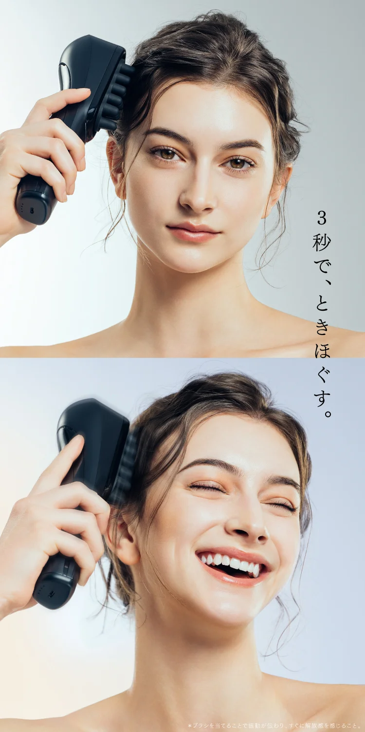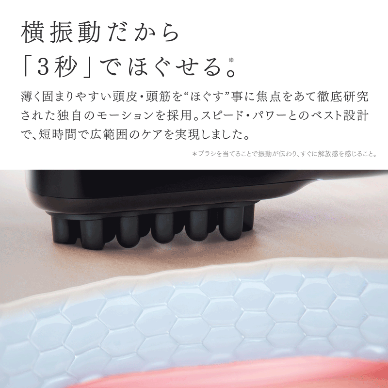 「3秒」でほぐせる。※ 薄く固まりやすい頭皮・頭筋を“ほぐす”事に焦点をあて徹底研究された独自のモーションを採用。スピード・パワーとのベスト設計で、短時間で広範囲のケアを実現しました。 *ブラシを当てることで振動が伝わり、すぐに解放感を感じること。