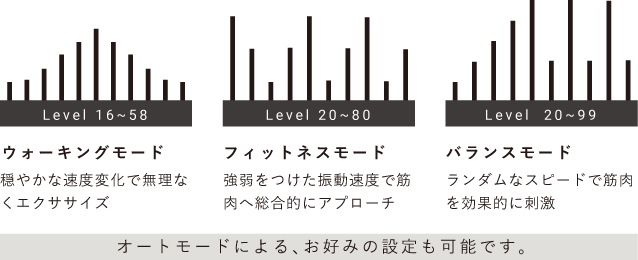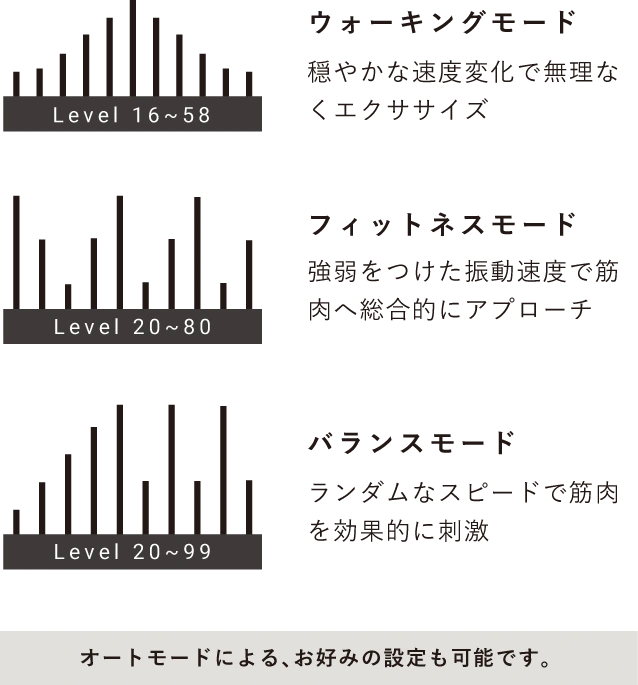 99段階まで選べる圧巻の振動パワーが、筋肉や気になる箇所に深く、強力にアプローチ。3つのモーションプログラムで、目的に合わせたボディケアをサポートします。