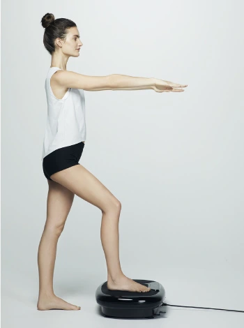背筋を伸ばし、本体に片足を乗せて腕を前に出します。腹筋を意識しながらバランスをとります。